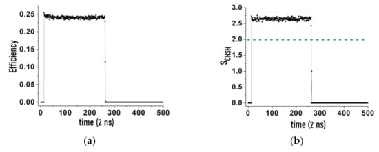 Measured <η>(t) (a) and SCHSH(t) (b) in the 2019 experiment [], τres = 2 ns, τpulse = 500 ns, τ = 0.5 ns, Rp = 50 KHz, station A. Horizontal dotted line indicates the limit given by CHSH inequality.