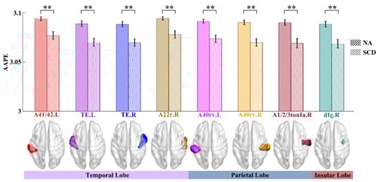 We firstly obtained the regional AAPE as the complexity by averaging the AAPE values of all voxels within each ROI in the Brainnetome atlas. Next, by performing the two-sample t-test on each ROI, eight ROIs can be found to exhibit significant differences (p < 0.01, FDR corrected) between NA and SCD groups. As shown in Figure 2, the average AAPE values of the SCD group were relatively lower than those of the NA group for all of the eight ROIs. These ROIs included the subregions of the bilateral superior temporal gyrus (STG) (A41/42.L, TE.L, TE.R and A22r.R), the rostroventral areas of the bilateral inferior parietal lobule (IPL) (A40rv.L and A40rv.R), the tongue and larynx region of the right postcentral gyrus (PoG) (A1/2/3tonIa.R) and the dorsal granular insula of the right insular gyrus (INS) (dIg.R). They were predominantly in the temporal and parietal lobes as well as the insular lobe.