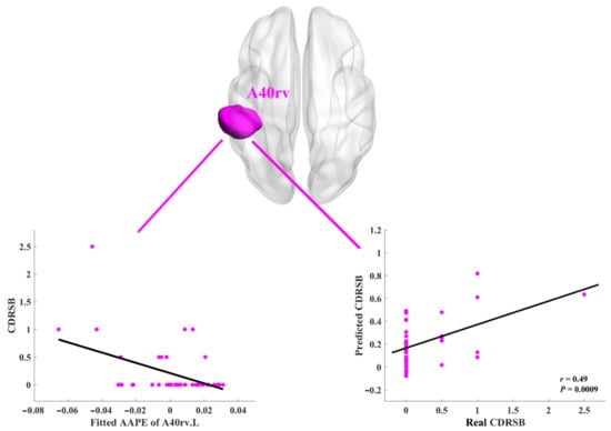 Additionally, after Bonferroni correction for multiple ROIs and multiple measures, we only found the clearly decreased trend and good prediction in the A40rv.L and the measure of CDRSB. The results were presented in Figure 3. Generally, the AAPE values in the subregions of STG, IPL, and INS were related to the neuropsychological assessments of CDRSB and MMSE.