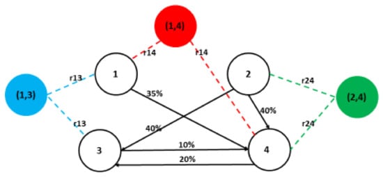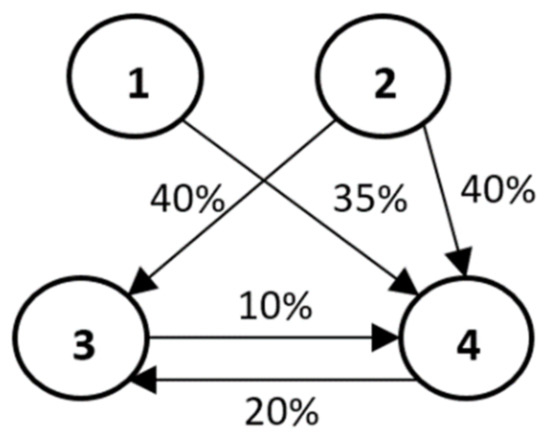 Let the set , , describe a set of companies that results from an unobservable set of companies connected by ownership relations. These companies create the market of these companies, which is not necessarily homogeneous in terms of, for example, industry or organizational form (e.g., joint-stock companies, limited liability companies, etc.). In Figure 1, we present an example of such a market, consisting of four companies in different relationships with each other.