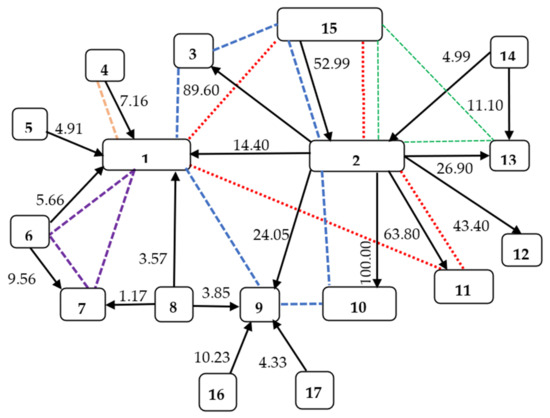 The values (in billion US dollars) of the companies in the Stellantis network are = (68.05, 20.53, 0.26, 3.36, 8.03, 6.39, 29.99, 139.72, 55.33, 0.16, 1.20, 0.002, 23.69, 0.00, 10.00, 0.00, 48.64), respectively. As most of the companies in the example are listed, the values in the vector W represent the stock exchange values, i.e., their market capitalization (Retrieved from https://companiesmarketcap.com/ (accessed on 12 August 2021)). The market capitalization is commonly used to measure the value of a publicly listed company. It is calculated by multiplying the current market price of a company’s shares with the number of outstanding shares (https://www.investopedia.com/investing/market-capitalization-defined (accessed on 12 August 2021)).