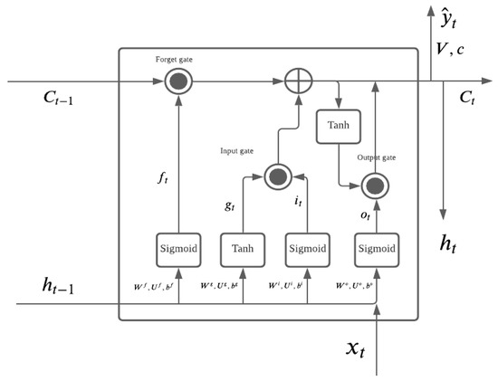 With the development of computational power in electronic equipment, powerful computers provide many learning algorithms and approaches in time series forecasting [44,45,46]. Deep learning is one of the popular approaches in recent years; it provides a complex model that has at least the potential to capture (and often does capture) more general information from the predictors than a traditional model, such as ARMA. Long short-term memory (LSTM) is a special kind of recurrent neural network introduced by Hochreiter and Schmidhuber in 1997 [47]. LSTM manages the two state vectors, the short-term state and long term state , and uses the gating mechanism by adding linear components from the previous layer in order to provide the long memory. LSTM has been widely used in time series forecasting because it is able to capture more information in the time series data, particularly for the financial econometrics area, where the price of financial assets depends on various different factors that are difficult to represent by a linear model [46,48]. Each LSTM layer, including the cells of the forget gate, input gate, and output gate, is shown in Figure 1.