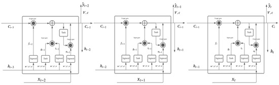 The output gate controls how much long-term information should be carried forward to the next layer, and it also contributes to the short-term state of . The result from the output gate function is also between 0 and 1, and the LSTM short-term state also uses element-wise multiplication, with . An LSTM with more than one layer is shown in Figure 2, and its structure enables the LSTM to capture long-term and short-term information in order to forecast. As usual, an LSTM is trained by back propagation as other neural network models are. An LSTM requires time series data to train the model, and its time series pattern will be modeled in every layer of the network.