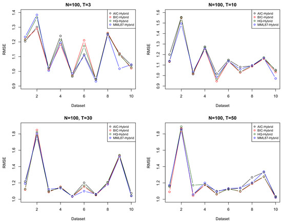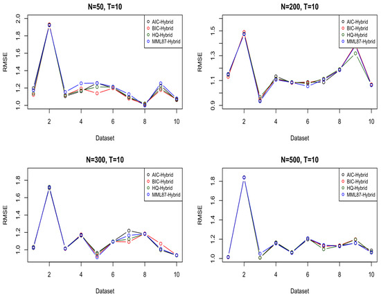 For a small in-sample size, such as , the BIC performance is good on the hybrid ARMA-LSTM because BIC is able to select the model well without overfitting. The MML87-Hybrid has the smallest average RMSE for , and 300 for the different randomized datasets. The hybrid models work efficiently when there is enough in-sample data; otherwise, it can also overfit small datasets. In the meantime, by comparing the RMSE from MML87-ARMA, AIC-ARMA, BIC-ARMA, and HQ-ARMA, the results favor MML87 rather than AIC, BIC, and HQ. MML87 has a good performance in time series model selection and is able to select the ARMA model with lower forecasting errors. However, as noted earlier in this section, given that the simulated data were generated from an ARMA model, it is not immediately apparent why adding LSTM to produce a hybrid model should be advantageous in the case of larger datasets (although we would typically expect this if not dealing with data that are purely from an ARMA model). Figure 4 shows the comparison of RMSE in the in-sample size N = 50, 200, 300, and 500.