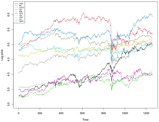 The empirical results show that the hybrid ARIMA-LSTM model can substantially outperform the traditional ARIMA (Autoregressive Integrated Moving Average) time series model, particularly in the forecast window sizes of , and 200. Many studies demonstrated that the stock return depends on various factors, such as dividend yield, the book to market ratio, and/or interest rate [51,53,54]. However, traditional linear time series models are not able to take into account the effect of all those factors, thus requiring a more complex model to capture the information hidden in residuals from the ARIMA model. The hybrid model with LSTM is able to model publicly available and other information, which we have no reason to believe will be restricted, coming from a purely ARMA or ARIMA model. In order to make the stock price stationary in time series analysis, the ARIMA models are using the parameter (or, equivalently, first-order differencing). As the experimental results show, MML87 outperforms the other information-theoretic criteria AIC, BIC, and HQ in terms of lower root mean squared error for out-of-sample forecasting. Figure 5 demonstrates the log prices for stock prices selected in this experiment.