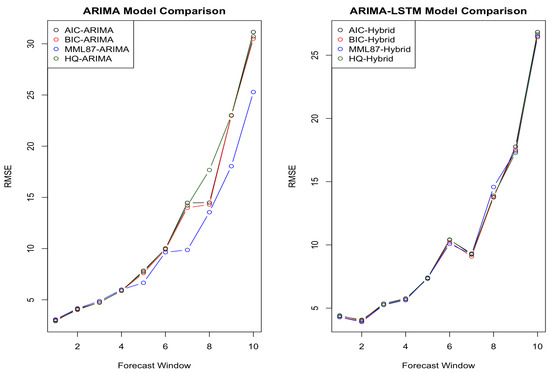 Table A5, Table A6, Table A7 and Table A8 compare six different models or model selection techniques in the RMSE of the dataset in , and 500, with the forecast window size . AIC tends to overfit for small datasets, such as (Data provided by Table A5 in Appendix A). Through an increase in the amount for the in-sample dataset, the RMSE decreases in the hybrid ARMA-LSTM model because the larger size of data helps the LSTM to train and fit an accurate model. Thus, the results show the RMSE for the MML87 model is lower than the other models in the range , and 300. Because of the efficiency in controlling the model complexity in MML87, the model can avoid the overfitting problem for small datasets.