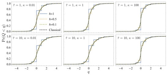 In Figure 1, we show the cumulative heat distribution function  with different friction coefficients  and 100, at the rescaled relaxation time  and 10. We set the mass  and the frequency  for the system harmonic oscillator, the inverse temperatures  and  for the initial equilibrium states of the heat bath and the system, respectively. The Planck constant is set to be . With the decrease in ℏ, the quantum result Equation (17) approaches the classical result Equation (25). Thus, the quantum–classical correspondence of the heat distribution is demonstrated for generic values of the friction coefficient .