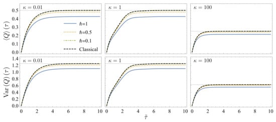 In Figure 2, we illustrate the results of the mean value  and the variance  with different friction coefficients  and 100. The parameters are the same as those in Figure 1. The quantum results approach the classical results with the decrease in ℏ. For  and 1 (left and middle subfigures), complete thermalization is reached when . The mean value and the variance approach  and (gray horizontal lines). For  (right subfigures), only the momentum degree of freedom is thermalized at this timescale. Thus, the mean value and the variance take half value of their long-time limits. When the coordinate degree of freedom is also thermalized in the long-time limit (), the mean value and the variance are expected to approach the same values as those in the middle subfigures.