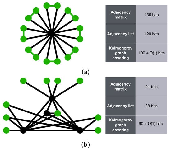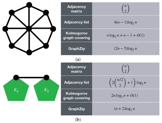 As stated, one important application of the Kolmogorov graph covering algorithm is to test and evaluate existing graph compression methods. In this section, we evaluate the performance of GraphZip [] on a number of graphs. GraphZip was introduced in 2018 as a lossless graph compression method for sparse graphs. This graph compression method identifies the biggest cliques within the input graph, and defines a new pseudo vertex for each of them. Ultimately, it represents the graph using an adjacency list approach, by considering the membership of a node in a clique as an edge between that node and the clique’s pseudo vertex. Figure 5 shows the results of applying Kolmogorov graph covering and GraphZip to two example graphs. It can be seen that one graph Kolmogorov graph covering provides a lower estimate for the K-complexity of the graph, whereas for the other one, GraphZip provides a shorter code length. This means that the graph of Figure 5a could have been compressed more efficiently, but GraphZip is already performing well for the graph of Figure 5b. It can also be observed that for both cases, the complexities are from the same order of magnitude. These examples show how the Kolmogorov graph covering can be used to evaluate the performance of lossless graph compression algorithms on single graphs.