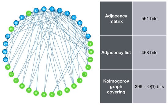 Zachary’s karate club is a graph based on the social interactions of the members of a karate club that was studied by Wayne W. Zachary []. This graph is often used as a dataset in studies related to network science. In this section, we apply the Kolmogorov graph covering algorithm to this 34-node graph and measure its complexity. The result is illustrated in Figure 4.