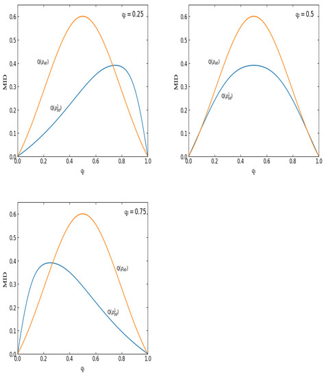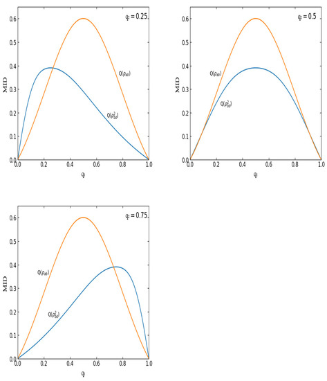 Secondly, let us turn to the MIDs in the final states. In the QC swapping progress, the final states are derived from the initial states due to the middle measurements. In this paper, the middle measurement states are selected as the four Bell states, respectively. Accordingly, two kinds of final states are obtained, i.e., and . Hence, two kinds of MIDs are derived, and . Obviously, () is determined by two parameters, and , which are from the initial states. In Figure 1 and Figure 2, and are depicted with for , respectively.
