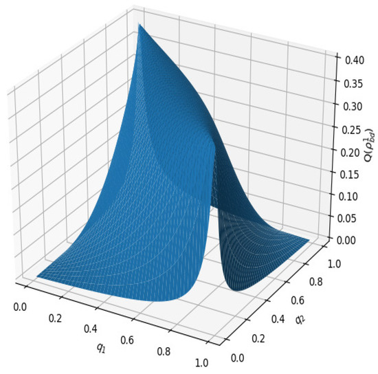 Firstly, let us briefly see the monotony features of MID in the initial states for the kind of separable state in Equations (1) and (2). All the captured QCs increase with q in the region and decrease with q in the region . Moreover, there exists an obvious symmetry. That is to say, QCs in both states with () are the same. See Figure 1 for an example. In Figure 1, MIDs in the initial state and final state are described for .