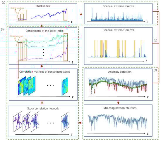 b, we first select the constituents of the stock index, then calculate the matrices of Pearson correlation coefficients based on the logarithmic return of the constituents through a sliding window, and finally extract the most important correlations in the matrix to form a stock correlation network. In step