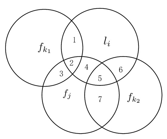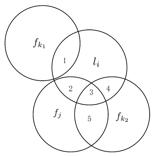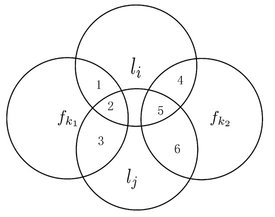 In Figure 1, we assume that and are two candidate features, is a selected feature in S, and is a label in the total label set L. is irrelevant to , and is redundant with . The amount of information provided by to is mutual information , that is, the area . If is selected, then the amount of information provided by to will be , which corresponds to the area . If is selected, then the amount of information provided by to will be , which corresponds to the area since the area is less than the area , . Therefore, the higher the label-related redundancy between the candidate feature and the selected feature in the current selected feature subset, the greater the amount of information between and is reduced. In other words, the label-related redundancy between the candidate feature and the selected features should be kept to a minimum. From this point of view, takes precedence over .
