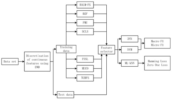 Against the demonstrated efficacy of TCRFS, we compare it to 6 advanced multi-label feature selection approaches (RALM-FS [40], D2F [41], PMU [42], SCLS [43], FSSL [44], and MUCO [45]), on 13 benchmark data sets in this section. As a result, we have conducted numerous experiments based on four different criteria using three classifiers, which are Support Vector Machine (SVM), 3-Nearest Neighbor (3NN), and Multi-Label k-Nearest Neighbor (ML-kNN) [46,47]. The 13 multi-label benchmark data sets utilized in the experiments are depicted first. Following that, the findings of the experiments are discussed and examined. Four evaluation metrics that we employed in the experiments have been offered in Section 2.2. The approximate experimental framework is depicted in Figure 4.