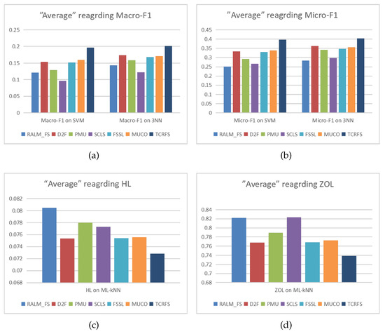 Observing Table 7 and Table 8, TCRFS delivers the optimum classification performance on SVM classifier regarding Macro- and Micro- measures, since the higher the values of the two measures, the more superior the classification performance. In Table 9, except for the Yeast data set, TCRFS beats 6 other contrasted approaches on 12 data sets using 3NN classifier for Macro-. TCRFS surpasses the other 6 contrasted approaches on 11 data sets using the 3NN classifier for Micro- in Table 10. According to the properties of the HL and ZOL measures, the lower values of the two measures mean the more excellent classification performance. In Table 11 and Table 12, TCRFS can exhibit the best system performance on 11 data sets on the ML-kNN classifier for the HL and ZOL criteria. In some cases, comprehensive consideration of the three key aspects to assess feature relevance does not achieve the best classification effect. The classification results of D2F takes the first position on the Yeast data set regarding Macro- on the 3NN classifier. PMU and RALM-FS possess the optimal classification performance on the Yeast data set and the Education data sets, respectively. In terms of HL (Table 11), RALM-FS and SCLS surpass other approaches on the Birds and Emotions data sets, respectively. In terms of ZOL (Table 12), FSSL and D2F surpass other approaches on the Birds and Emotions data sets, respectively. Despite the fact that D2F, PMU, RALM-FS, SCLS and FSSL have the greatest system performance on individual data sets, the overall optimal classification performance is still TCRFS. The average values of each method for different evaluation criteria are illustrated in Figure 5. The abscissa and different colored bars represent different feature selection methods, while the ordinate represents the average value.