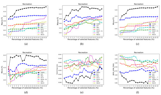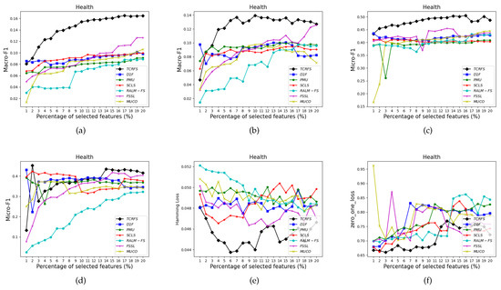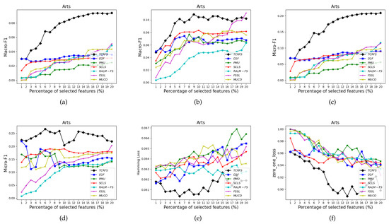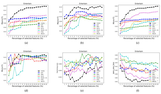 Figure 6, Figure 7, Figure 8 and Figure 9 indicate that TCRFS delivers superior classification performance on the Arts, Recreation, Entertain, and Health data sets regarding the four evaluation criteria. As shown in Figure 6, the classification performance of our method is significantly better than the other six contrasted methods. On the Recreation data set (Figure 7), the classification performance of the method is not constantly improved by increasing the number of selected features. TCRFS, for example, may obtain the most significant classification results regarding the ZOL measure when the number of selected features is set at 8% or 11% of the total number of features. On the Entertain data set (Figure 8), TCRFS is clearly in the lead regarding Macro- when the percentage of the selected features is larger than one. In terms of HL and ZOL, TCRFS also possesses significant advantages among the seven methods. The proposed method can obtain the optimum classification performance for each metric when the percentage of the selected features is set to 6%. In Figure 9, our method outperforms the other six contrasted methods on the Health data set utilizing the four metrics. Although in most cases the performance of feature selection methods improves as the number of selected features increases, as the number of features increases to a certain number, the improvement in the classification performance tends to be flat. When the percentage of the number of features increases to about 16% on the Arts data set (Figure 6a–d) and the percentage of the number of features increases to about 19% on the Entertain data (Figure 8a–d), the classification performance has reached a relatively high level. That is to say, an optimal feature subset is to select a smaller number of features to achieve a better classification performance. However, some methods appear to have the same classification performance as TCRFS in Figure 8d and Figure 9e, but TCRFS is superior on average, and they are not as excellent as TCRFS overall. As a consequence, it is critical to consider the three types of conditional relevance for multi-label feature selection.