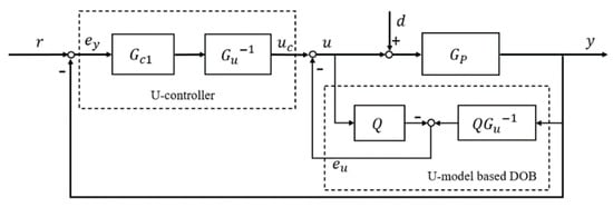 Although U-control shows high efficiency in the case of model matching, its high sensitivity to inversion [21] limits its real-time control application. UDOB stated its advantages in observing lumped disturbance in Section 3.1, by combining the lumped disturbance and system input into the same channel, the control system design and disturbance compensation will be much easily realized. Accordingly, U-control can cooperate with UDOB’s rapid response, and UDOB can reduce U-control’s sensitivity to accurate modelling of the controlled plants (improving system robustness). Therefore, combining the advantages of both, this paper proposes a novel UDOB enhanced U-control method (DOBUC). The structure of DOBUC is shown in Figure 4.