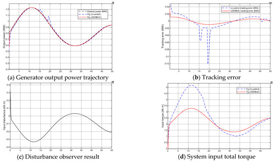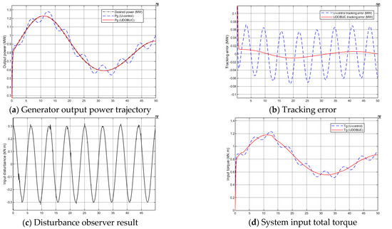 The generator response results are shown in Figure 10. When the disturbance appears in the input channel of the control system, the tracking curve of U-control method has a large fluctuation, and DOBUC can perfectly track the desired power from Figure 10a. The proposed UDOB can accurately observe the input disturbance, and integrate all other errors including unmeasurable wind speed and system uncertainties into the input disturbance and then compensate from Figure 10c,d. Impartially, the proposed UDOB shows strong strength in disturbance observation and integration, and this input compensation control method for suppressing lumped disturbance is very convenient for the control system design and use.