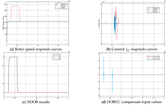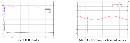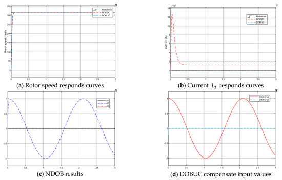 The rotor response results are shown in Figure 13. From Figure 13a,b, NDOBC method can enforce PMSM to be stable, but it cannot suppress the tracking error caused by disturbances. It also can observer that the proposed DOBUC method can attain good tracking requirements. The output of disturbance observer in NDOBC and DOBUC systems are shown in Figure 13c,d, respectively.