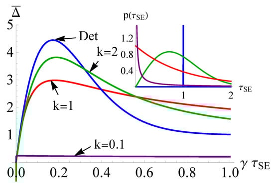 where is the average time between collisions and k determines the shape of the distribution, cfr. the inset of Figure 2. In particular, large k tends to regular intervals between collisions, i.e., corresponds to deterministic, equally-spaced collisions, as considered in Refs. [,] and Section 2.4 and Section 2.5, whereas small k is characterised by bursts of collisions followed by long breaks []. For , the WTD corresponds to the exponential distribution characterising a Poisson point process. We remark that our results remain qualitatively unaffected for other families of WTD, e.g., Erlang distributions.