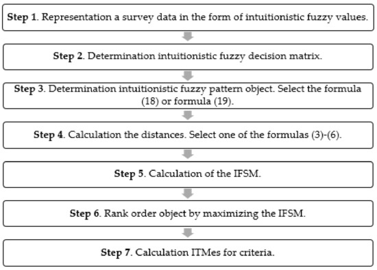 18] presents the concept of the IFSM using Hellwig’s approach for the intuitionistic fuzzy sets. The IFSM allows measuring complex phenomena based on the respondents’ opinions. The IFSM adopts that the respondents assess objects in terms of the adopted criteria using ordinal measurement scales. The respondents’ opinion measurement results are later transformed into intuitionistic fuzzy sets. In another paper [