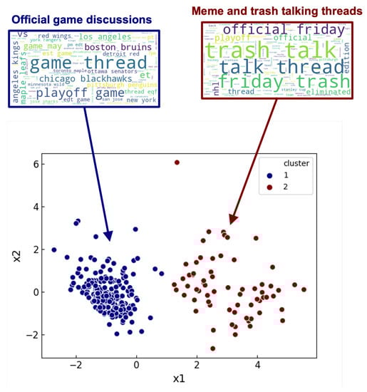 As seen in Figure 2, there are two apparent clusters, delineating a difference in comment structure within the Subreddit itself. Using the word clouds complemented with a cursory textual analysis of the involved submissions, we see that cluster 1 contains submissions pertaining to official “Game Thread” discussions, while cluster 2 is primarily related to trash talking and memes. We further reinforce our word cloud observation by also counting the frequency of occurrence of some of the top keywords in the text pools of both clusters, shown in Table 3.