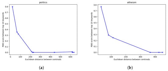 RBO score of top 10 keyword lists versus Euclidean distance of response feature clusters for (a) where and (b) where . RBO’s weight parameter p is set to .