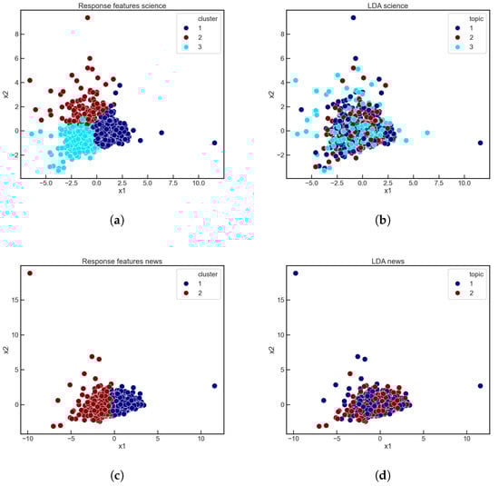 Comparison of clustering patterns with response feature K-means (a,c) and LDA (b,d) on the Subreddits (a,b) and (c,d).