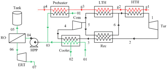 The schematic diagram of the proposed power-water cogeneration system consisting of a supercritical carbon dioxide Brayton cycle and reverse osmosis unit is shown in Figure 1. The high-temperature high-pressure carbon dioxide (Point 1) expands in the turbine (Tur) to generate power. Then, the exhausted working fluid (Point 2) flows into the recuperator (Rec) and cooler successively to release heat. After that, the carbon dioxide (Point 4) is compressed to high pressure by the compressor (Com). The compressed working fluid (Point 5) is divided into two parts: the first part of carbon dioxide flows into the low-temperature heater (LTH) to absorb heat from flue gas; while the other part enters the recuperator to absorb heat from the low-pressure carbon dioxide. The working fluid mixes at Point 6 and then absorbs heat in the high-temperature heater (HTH) to complete the supercritical carbon dioxide Brayton cycle.