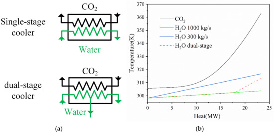 It is worth noting that the structure of the cooler is different from typical heat exchangers. The traditional heat exchanger is named as a single-stage cooler while the heat exchanger adopted in this paper is named as a dual-stage cooler. In the dual-stage cooler, the feed seawater firstly flows into the cooler to cool the carbon dioxide. Then, part of the seawater is discharged directly while the other part of the seawater is further preheated to a higher temperature. For comparison, two different types of heat exchangers are shown in Figure 2a and the corresponding temperature-heat load diagram is shown in Figure 2b. The advantages of a dual-stage cooler can be explained by the unique thermodynamic properties of carbon dioxide. When the state point is far away from the critical point, the heat capacity of carbon dioxide is almost constant. However, as the state point gets closer to the critical point, the heat capacity increases dramatically. On the contrary, the heat capacity of cooling water is almost constant. Thus, in the temperature-heat diagram, the slope of the water side is first bigger then smaller than that of the CO2 side. If a traditional heat exchanger is adopted as the cooler, the pinch point temperature difference might be very small when the mass flow rate of the cooling water is small, as shown by the blue line in Figure 2b. On the other hand, the outlet temperature of the seawater might not be preheated to the given preheating temperature when the mass flow rate of the cooling water is large, as shown by the green line in Figure 2b. In order to overcome the problem, the dual-stage cooler is employed. By discharging the majority of the feed seawater in the middle of the cooler, the average temperature difference of the cooler can be controlled within an acceptable range and the remaining part of the seawater can be preheated sufficiently, as shown by the red dotted line in Figure 2b.