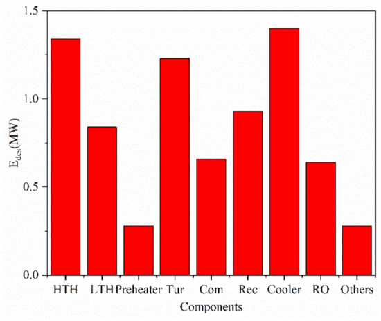 In this section, the exergy analysis and economic analysis are carried out for the design case. As shown in Figure 3, the exergy destruction of the heat exchangers is higher than the turbomachines. The exergy destruction of the cooler and high-temperature heater dominates the exergy destruction of the proposed water-power cogeneration system, which is caused by the numerous heat transfer amount and large heat transfer temperature difference. The exergy destruction related with the turbine is also large because of the irreversibility of the expansion process. The “Others” in Figure 3 mainly involves the unexploited exergy of the flue gas, which is discharged into the environment. It can be seen that the unexploited exergy is very small compared with the total exergy input of the flue gas, which indicates the proposed water-power cogeneration system can recover the waste heat of the gas turbine sufficiently and effectively. Compared with the carbon dioxide power cycle, the exergy destruction of RO unit is relatively small since the water productivity of the RO unit is low. However, if the requirement for fresh water increases, the exergy destruction of the RO unit will rise proportionally.