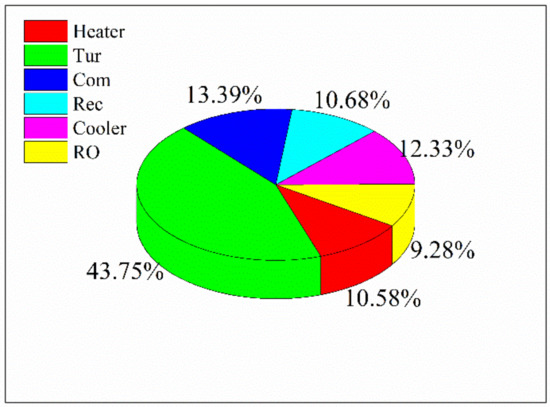 The investment costs of the components are shown in Figure 4. The cost of the “heater” includes the cost of the high-temperature heater, low-temperature heater, and preheater. Apparently, the investment cost of turbine occupied nearly half of the proposed water-power cogeneration system. On the contrary, the cost of the heater is relatively small because of the large temperature difference. As explained above, the RO unit further utilizes the waste heat of the flue gas and carbon dioxide cycle, which greatly improves the thermodynamic performance of the waste heat recovery system. Meanwhile, the investment cost of the RO unit is only 9.28% of the total cost. Therefore, the utilization of the RO unit would enhance the system thermal performance at a relatively small expense, leading to satisfactory overall performance.