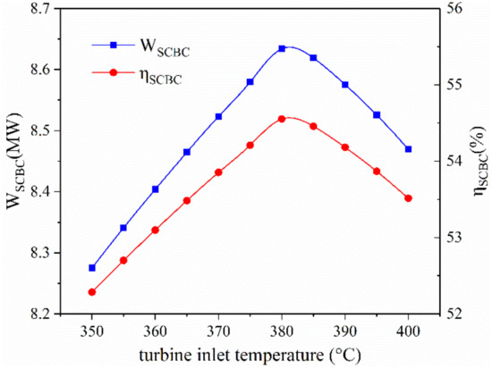 In this section, the performance of the proposed system is simulated and evaluated. The input parameters under the design conditions are displayed in Table 5 [15,30]. The simulation is carried out in MATLAB software and the thermodynamic properties of the carbon dioxide are obtained from REFPROP 9.1. Some important parameters, such as turbine inlet temperature (T1), split ratio (SR), and preheating temperature (T03), are analyzed to investigate their effects on the system performance. When one parameter is investigated, other parameters are fixed as design values. All parameters vary in reasonable ranges in the parametric analysis.