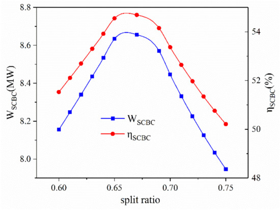 Figure 6 illustrates the effect of a split ratio on the system performance of the proposed cogeneration system. The splitting configuration is employed owing to the unique thermodynamic properties of carbon dioxide. When the operating temperature is near critical point, the specific heat capacity of carbon dioxide with high pressure is much higher than that of carbon dioxide with low pressure. Therefore, part of carbon dioxide is delivered into a low-temperature heater to make the heat capacity of the recuperator matched. Obviously, there is an optimal value of the split ratio at which the heat capacities of both sides of the recuperator are exactly matched. If the split ratio is larger than the optimal value, the carbon dioxide on the cold side of the recuperator cannot be preheated sufficiently. If the split ratio is smaller than the optimal value, the residual heat of carbon dioxide on the hot side of the recuperator cannot be fully recovered. Thereby, the power output and exergy efficiency of SCBC first increases then decreases with the increment of split ratio. Because of the same reason mentioned above, the performance of the RO unit will not be affected by the variation of the split ratio.