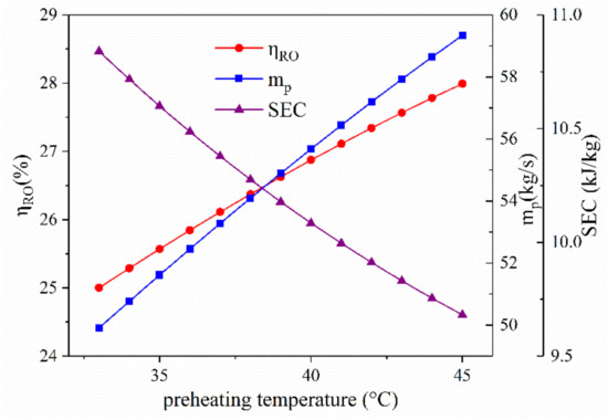 Figure 7 displays the effect of feed seawater preheating temperature on the system performance of the RO unit. As the preheating temperature increases, the water recovery ratio of the RO unit increases and the specific energy consumption of the RO unit decreases. The membrane transport parameters of water and solute increases with the increment of operating temperature [28]. Since the other parameters are constant, the mass flow rate of water passing through the membrane should show a rising trend, leading to a higher water recovery ratio. However, the solute passing through the membrane would also increase, which means the concentration of permeate water rises. On the other hand, the power consumption of RO unit is basically decided by the high-pressure pump and energy recovery turbine. Therefore, the specific energy consumption declines since the mass flow rate of permeate water increases.