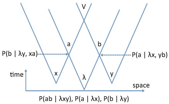 Taken together, the conditions (EL) and (PC) entail the factorization , and therefore lead to Bell’s inequalities [19,20]. As a consequence, a theoretical framework violating Bell’s inequalities must reject at least one of the two hypotheses. For instance, quantum mechanics (QM) agrees with (EL), which can be seen as a consequence of relativistic causality but rejects (PC). This means that the description given by (or in the quantum case) is not complete, and that knowing does bring something new to Alice: then, condition (PC) can be violated, and Alice can make a “contextual inference” about Bob’s result.