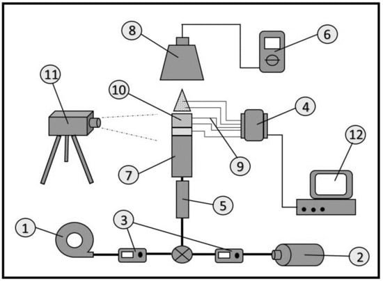 Schematic diagram of the PMB set-up. (1) Air pump, (2) Butane cartridge, (3) Flow meter controllers, (4) Data acquisition system (DAQ), (5) Mixing unit, (6) Gas analyzer, (7) Burner housing, (8) Smokestack collector, (9) K-type thermocouples, (10) Porous media, (11) Thermal imager, and (12) Personal computer.