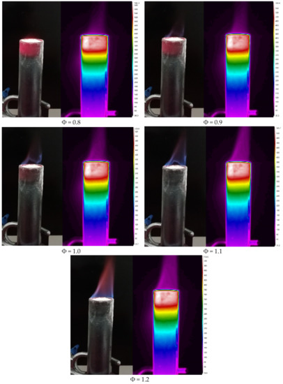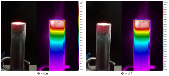 Photographs (left) and thermal (right) images of the double-layer PMB configuration with varies equivalence ratios.