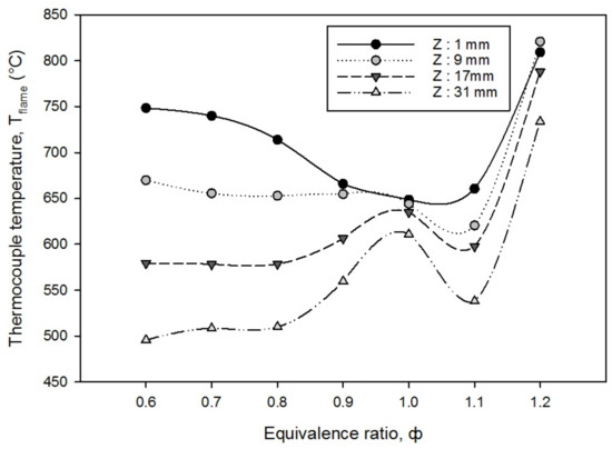 The temperature distribution of the flame is a key element in influencing the thermal and exergy efficiency of a double-layer PMB. Figure 4 depicts the flame temperature at various thermocouple heights, Z from the burner top surface (as indicated in Figure 2), with the Z-axis orientation changing as the equivalence ratio was gradually changed from lean to rich mixtures. The surface flame temperature is determined by measuring the temperature with thermocouples mounted on the top of the burner rim (as Z: 1 mm, 9 mm, 17 mm, and 31 mm). The flame location was calculated by determining the position of the flame temperature that achieved the highest values among four thermocouples with a variation in the equivalence ratios. The results demonstrate that the flame location did not change from 0.6 to 1.1 at Z: 1 mm equivalence ratio. With an increase in the flame velocity and butane flow rate at ϕ = 1.2, the flame location tended to move upward from Z: 1 mm to Z: 9 mm.