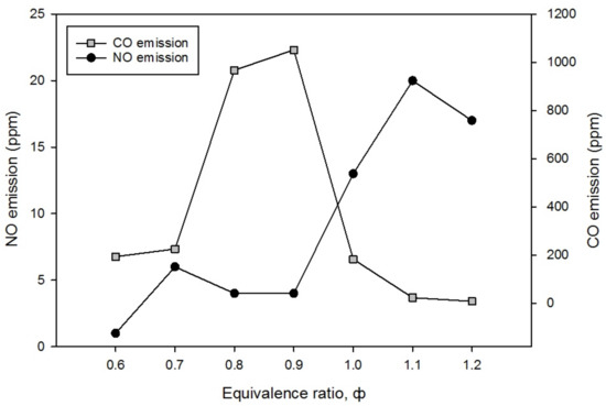 The CO and NO emission levels (ppm) with varies equivalence ratios.