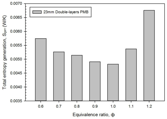 Figure 7 shows the influence of the equivalence ratio on the total entropy generation, Sgen, in a double-layer PMB premixed butane-air combustion. The overall entropy generation yielded the lowest value at an equivalence ratio of ϕ = 1.0 (stoichiometric mixture) as 0.0048 W/K. A uniform reduction in the entropy generation rate owing to the heat transfer conduction can be obtained by increasing the equivalence ratio from ϕ = 0.6 to a stoichiometric mixture of ϕ = 1.0. Thereafter, the entropy generation rate starts to increase significantly in rich combustion, from ϕ = 1.1 to ϕ = 1.2.