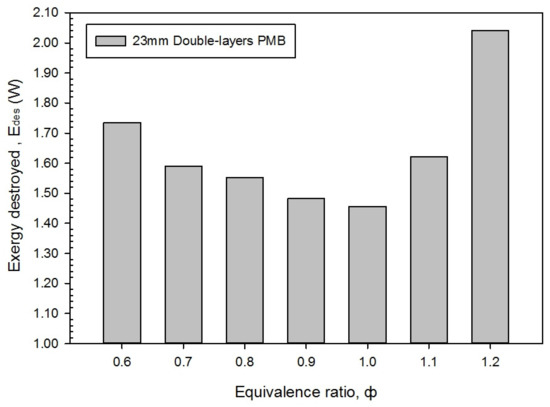 Figure 9 shows that the exergy destroyed, Edes with the variations in the equivalence ratio for a double-layer PMB. The exergy destroyed, which is attributed to the entropy generation, must be minimize in order to obtain better and improved energy performance in the PMB. Looking at Equation (11), the exergy destroyed obtained indicated that an increase in the equivalence ratio has resulted in the exergy destroyed reduces to the minimum at ϕ = 1.0 from ϕ = 0.6 in the lean mixtures and increases to the maximum at ϕ = 1.2 in the rich mixtures.