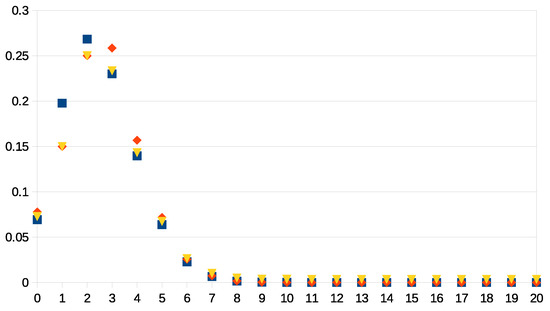 Probability as a function of the integer k running from 0 to 20, showing different updates of the binomial distribution with parameters and . The squares represent the binomial, the diamonds the update with the Hellinger distance, and the triangles the update with the square Bregman divergence. The empirical values are and .