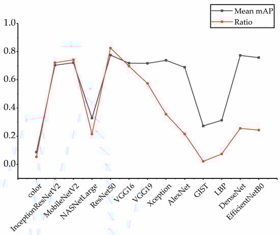 To further prove the rationality of the feature selection strategy proposed in this paper, we counted the ratio of each feature that was selected in 500 retrieved images and compared the relationship between the retrieval accuracy of each feature and the number of times it was selected; the results are shown in Figure 2. In the figure, “Mean mAP” refers to the average value of mAPs for single feature retrieval in different dimensions in Table 1, and “Ratio” refers to the ratio of each feature selected, i.e., the number of times it is selected divided by the number of retrieved images (500). According to Figure 2, The trend of the two broken lines is approximately the same, and the higher the retrieval accuracy of the features, the higher the probability of being selected. Thus, it can be shown that our feature selection method can select features with good results.