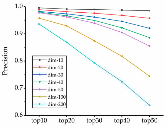 For the Corel-1K dataset, we randomly selected 20% of the images in each category as the images to be retrieved, for a total of 200 images, and the rest as the database images. Firstly, we reduce the dimensionality of each extracted feature by the PCA dimensionality reduction algorithm and then obtain the precision of top10, top20, top30, top40, and top50 in different dimensions. The results are shown in Figure 4. As we can see, image retrieval accuracy is highest when the features drop to 10 dimensions among any number of returned images. The reduction in dimensionality not only improves precision but also reduces computational effort and improves retrieval efficiency.