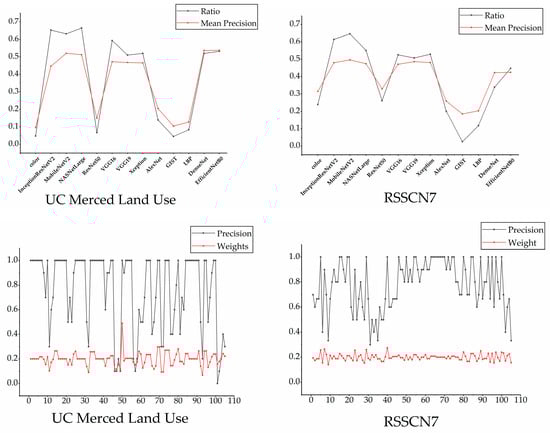 We also demonstrate the effectiveness of the feature selection strategy and weight update strategy in both datasets. In the UC Merced Land Use and RSSCN7 datasets, we selected 10 images in each category to obtain the relationship between the selected ratio and the mean precision of each feature. In addition, we selected 21 images to obtain the relationship between the retrieval accuracy and the final weights, and all the relationships are shown in Figure 7. From Figure 7, we can see that the proposed method still has good results in these two datasets.