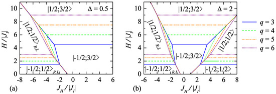 First, we take a look at possible magnetic ground-state arrangement of the model, which can be determined by a systematic inspection of the eigenvalues (5) of the plaquette Hamiltonian (1) for all possible combinations of quantum spin numbers , entering therein. The typical ground-state phase diagrams are depicted in Figure 2 in the parameter plane for two representative values of the exchange anisotropy and 2 by assuming four different numbers q of corner-sharing trigonal bipyramidal plaquettes forming 2D lattices. As one can see from Figure 2a, the ground-state phase diagram of the model with the easy-axis exchange anisotropy contains four different ground states. Specifically, two ground states are macroscopically degenerate quantum ferrimagnetic phases and , which differ from each other only by the orientation of Ising spins with respect to the applied magnetic field as indicated by the corresponding eigenvectors and eigenenergies per plaquette: