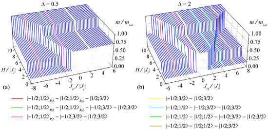 3D plots of the total magnetization m of the spin- Ising–Heisenberg model on the regular lattice with four corner-sharing bipyramidal plaquettes reduced to its saturation value as a function of the magnetic field and the interaction ratio for the exchange anisotropy (a) and (b) at the temperature obtained by MC simulations for the lattice with nodal Ising spins (19,800 bipyramidal plaquettes) by using MC steps per node. The curves of distinct colors refer to different magnetization scenarios listed in the legend.