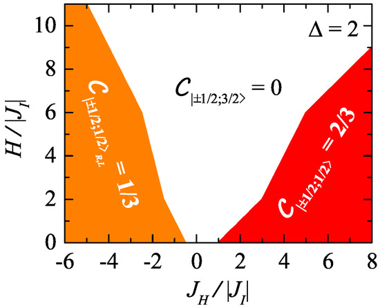 A different situation can be found in Figure 5b, which illustrates the sequence of field-induced phase transitions . Here, the low-temperature concurrence , which can be observed at the magnetic fields due to the presence of the unique quantum phases , comes from the positive value of the transverse pair correlation function(s) , the negative longitudinal correlation function , and the reduced local magnetization . It is easy to understand from the values of and that the origin of the local quantum bipartite entanglement of the Heisenberg spins peculiar to the unique quantum phases lies in ferromagnetic correlations and these are twice as strong as the antiferromagnetic ones along z-axis.